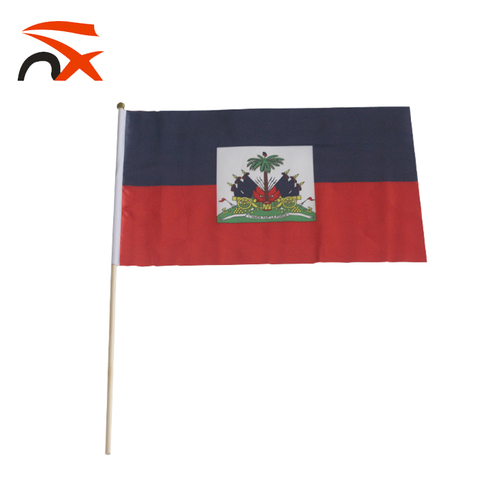 Promoción de tamaño personalizado pequeña bandera ondeante de mano haitiana con palo de bandera
