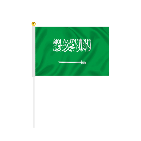 Logotipo personalizado de alta calidad, banderas de mano de Arabia Saudita con pantalla impresa, banderas de mano de poliéster 100% para competición de fútbol mundial